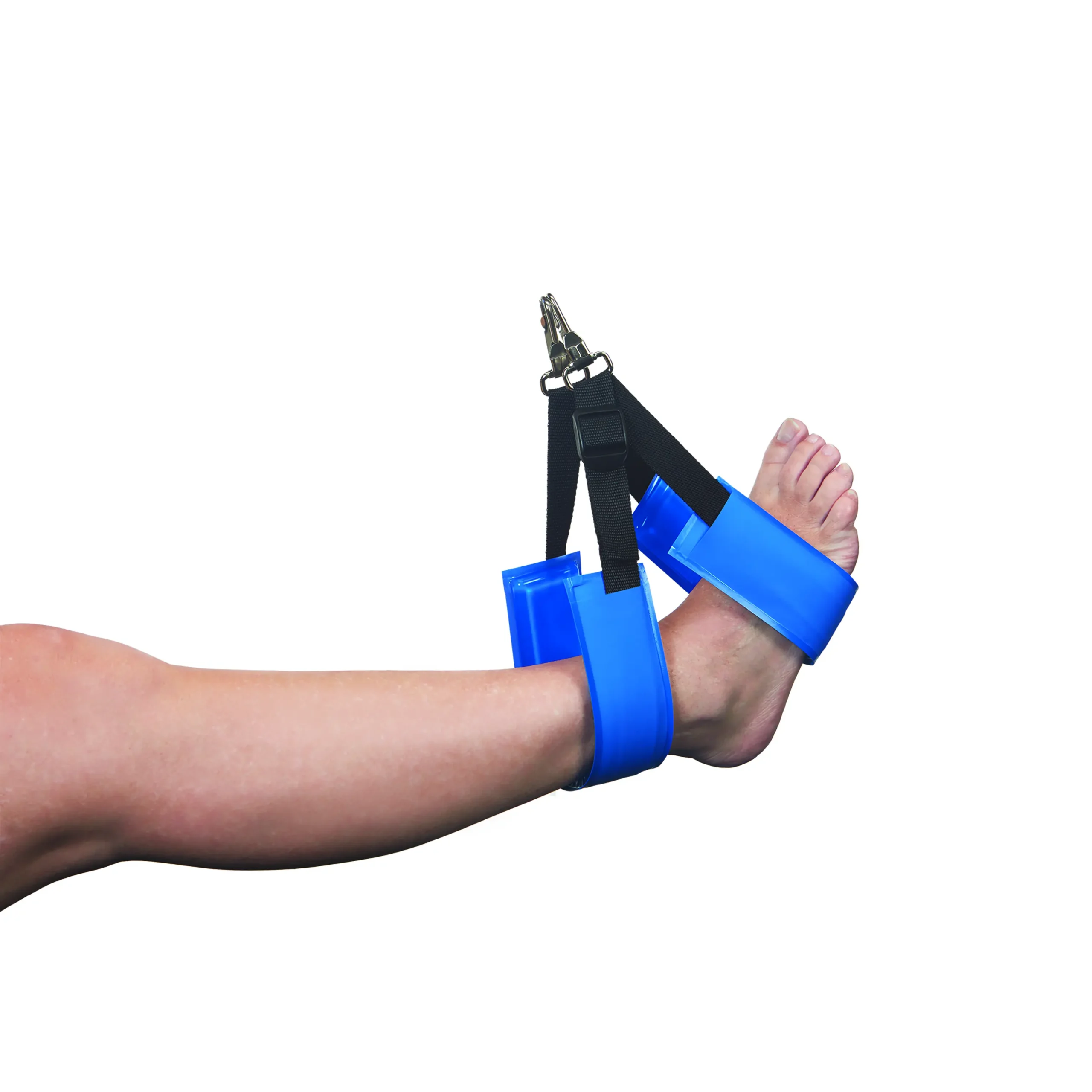 | Image Alt Text | A person's leg wearing the AliMed AliBlue Gel Ankle Stirrup Pad, designed for ankle support with adjustable blue straps. |