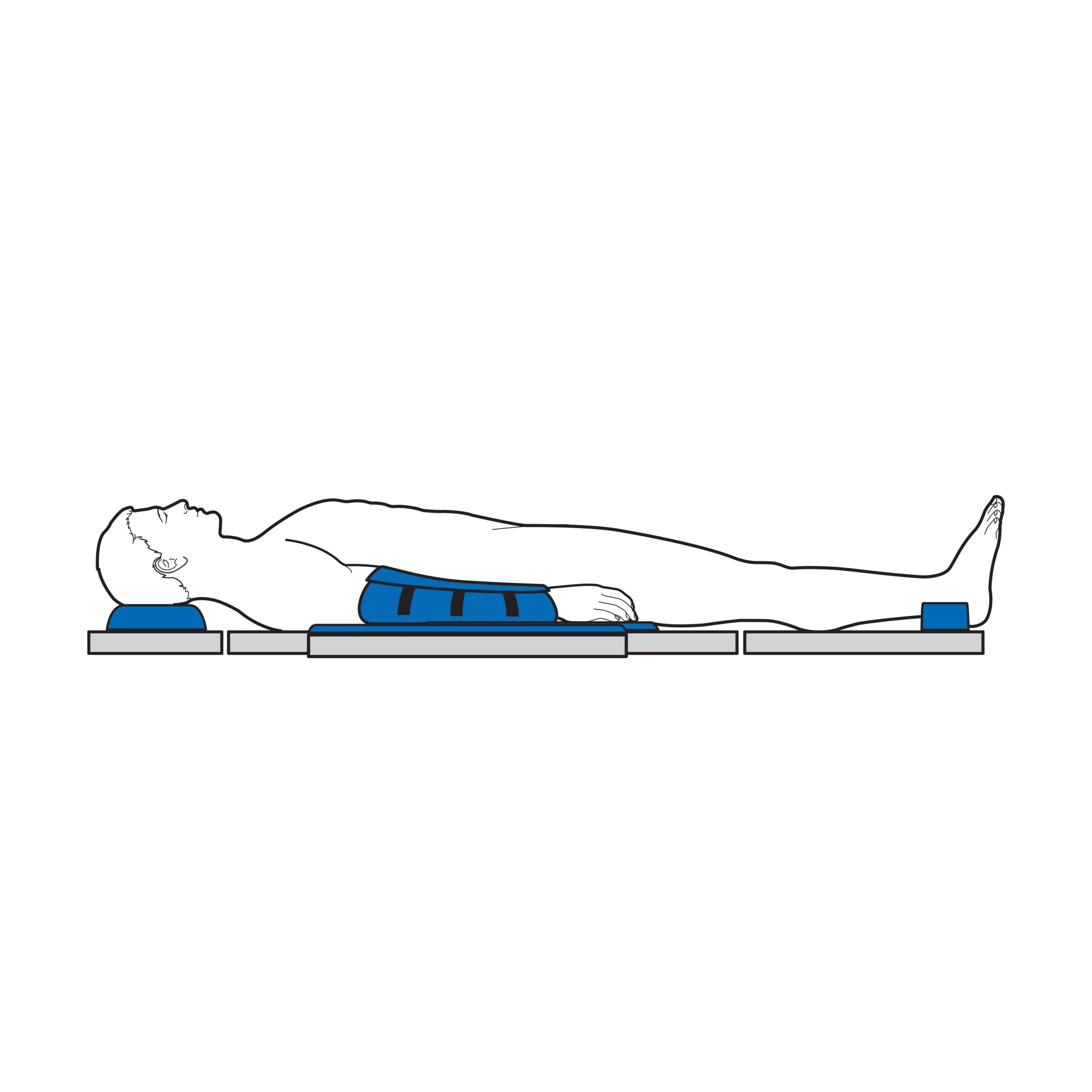 | Image Alt Text | A person lies on a flat surface, supported by the AliMed AliBlue Gel Basic Positioning Set under the neck, pelvis, and feet. |